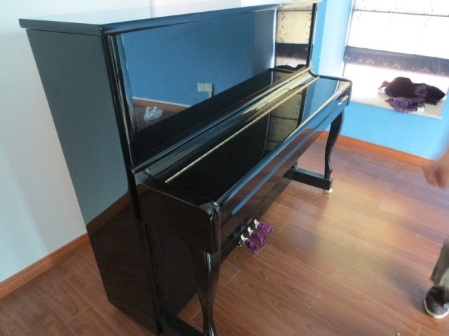 走路时必须注意,钢琴不能过度倾斜,它与地面的斜度不能超过70度。搬动时,钢琴背朝墙,键盘朝楼梯扶手。二个在下,三个在上,最好用宽布条背在肩上搭着钢琴的车脚。与此同时,双手抓住琴背的手柄和键盘下面(不能拉钢琴的腿),将钢琴抬起,一鼓作气移到地面,然后休息。尤其注意,键盘的一侧不要碰扶手,脚不要碰楼梯。拐弯到第一个楼层的时候要小心碰撞,调整好方向后再抬起向上。进入房间时,还要小心擦拭门框,确保最后将钢琴安全地放在已安排好的位置。